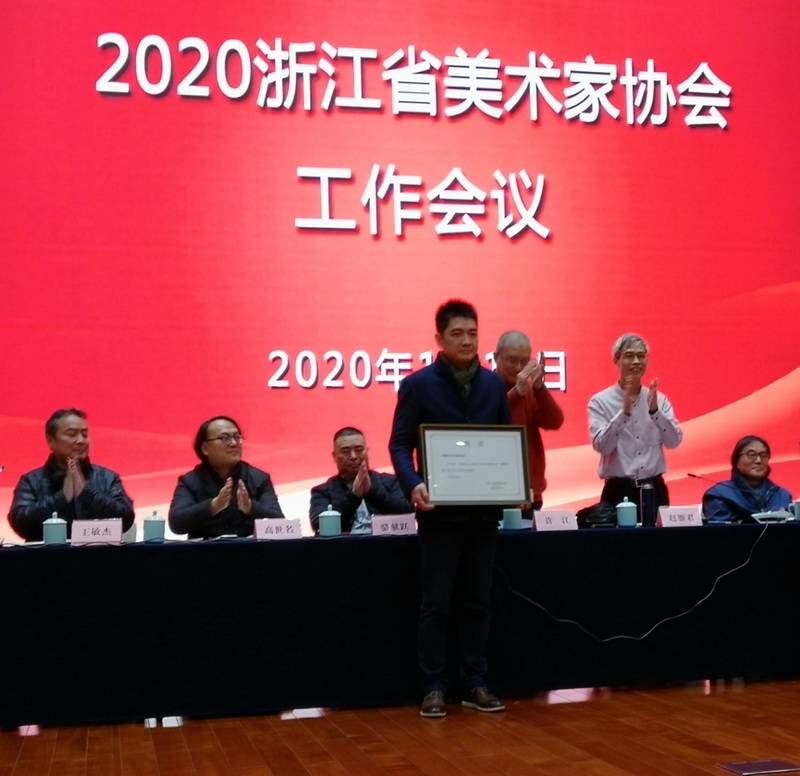 1月12日,2020年浙江省美术家协会工作会议在浙江展览馆召开。我市美术家协会与浙江省漫画家协会获得了2019年度浙江省美术工作先进集体称号,浙江省文联主席、浙江省美协主席许江和浙江省文联副主席、书记处书记赵雁君为获奖单位代表颁奖。
