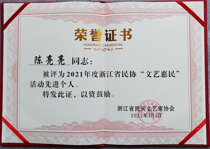 3月3日,浙江省民间文艺家协会第九届二次理事会暨2022年度工作会议在慈溪召开,会上传来喜讯,奉化区民间文艺家协会陈亮亮被评为2021年度浙江省民协“文艺惠民”活动先进个人。