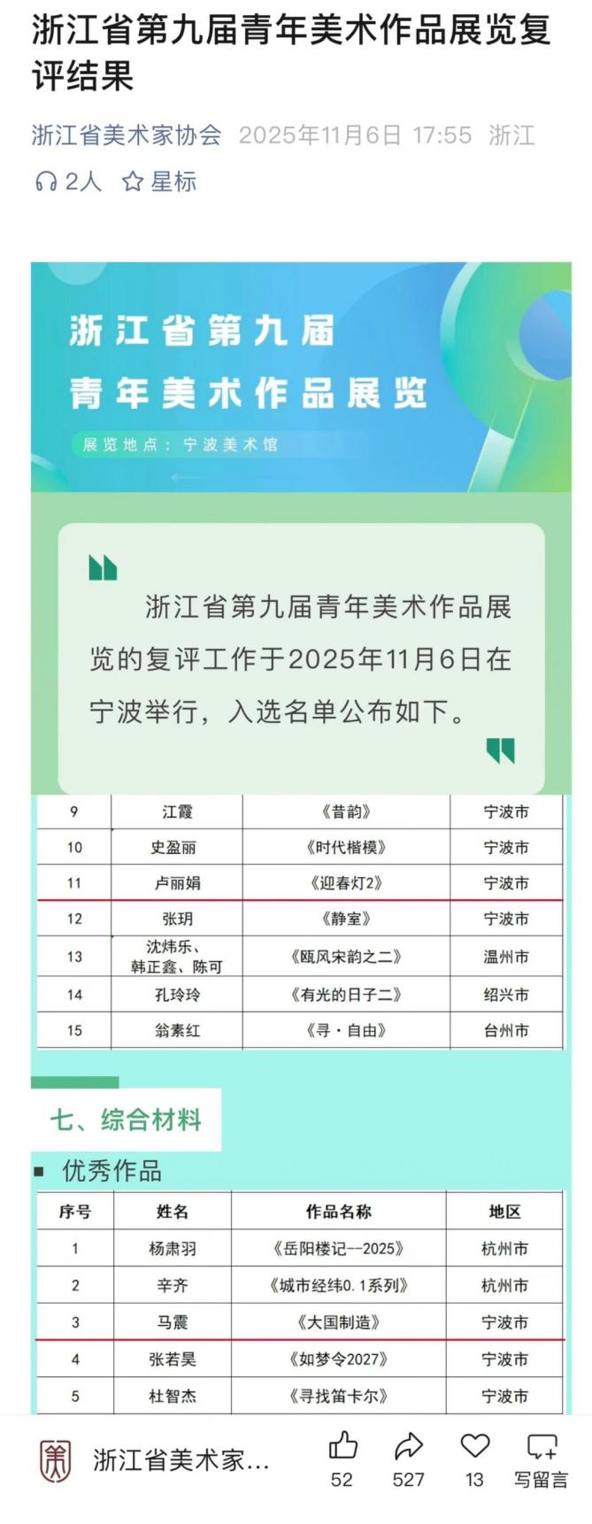 喜讯|马震、卢丽娟入选浙江省第九届青年美术作品展