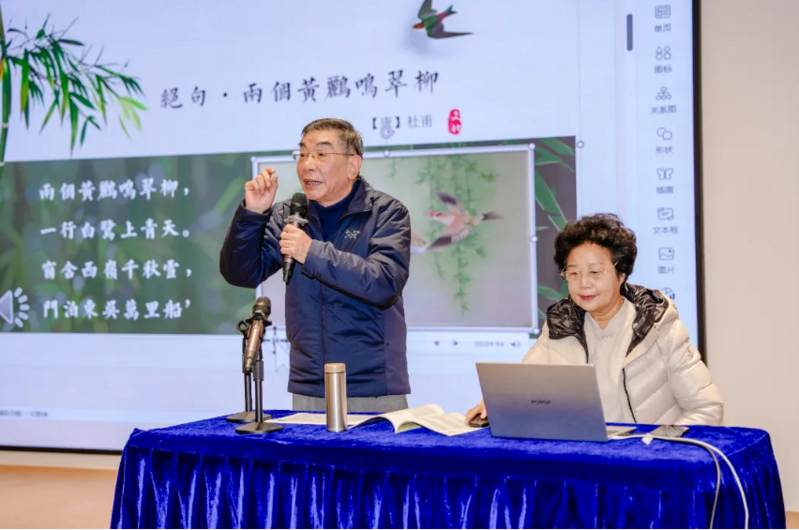 讲座中,竺小招围绕“越剧竺派艺术与越韵古诗鉴赏”,深入浅出地讲解了竺派艺术的起源、特色与传承脉络;吴尧东亲自示范,用醇厚典雅、韵味独特的竺派唱腔,演绎了多首精心谱曲的古典诗词。当千年古诗遇上百年越韵,文字的情致与唱腔的韵律水乳交融,赋予了全新的生命与情感深度。