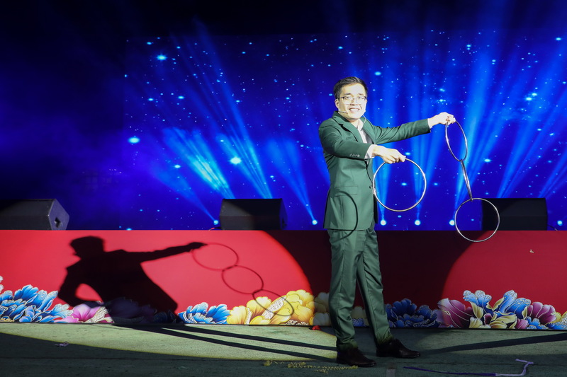演出节目形式多样,内容丰富,高潮迭起。充满互动趣味的《呼啦圈转转转》展现了活力与技巧;悠扬动人的器乐合奏《珊瑚颂》带来了经典旋律的洗礼;女声独唱《九儿》《美丽的神话》《光亮》情感充沛,令人动容。《美猴王模仿秀》表演者扮相惟妙惟肖,身手灵动矫健;二胡独奏《战马奔腾》以磅礴的气势和精湛的技艺奏响了激越昂扬旋律;惊险刺激又妙趣横生的杂技《功夫厨师》让观众在惊叹于演员高超技艺的同时捧腹不已;魔术《梦之国》表演者——宁波市杂技家协会主席董亮以娴熟的手法营造出梦幻神奇的舞台效果,引发全场阵阵惊叹,喝彩声此起彼伏,将现场气氛推向高潮。表演间隙穿插的抽奖环节更是点燃全场热情。在场职工踊跃参与,共享欢乐时刻与惊喜福利。最后,大碶街道横河工业社区带来的尾声舞蹈《竹编出幸福路》,用优美的舞姿勾勒出幸福生活、喜悦劳动的美好图景,为演出画上圆满句号。